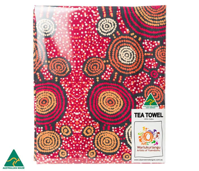 Elevate your kitchen decor with our Aboriginal Art Tea Towel, featuring artwork by Teddy Gibson. Crafted from cotton and packaged with information about the artist and artwork, each tea towel is a unique piece of art. With dimensions of approximately 45cm x 75cm, these tea towels vary in artwork placement, making each one distinctive. They make for a thoughtful and artistic gift or souvenir."